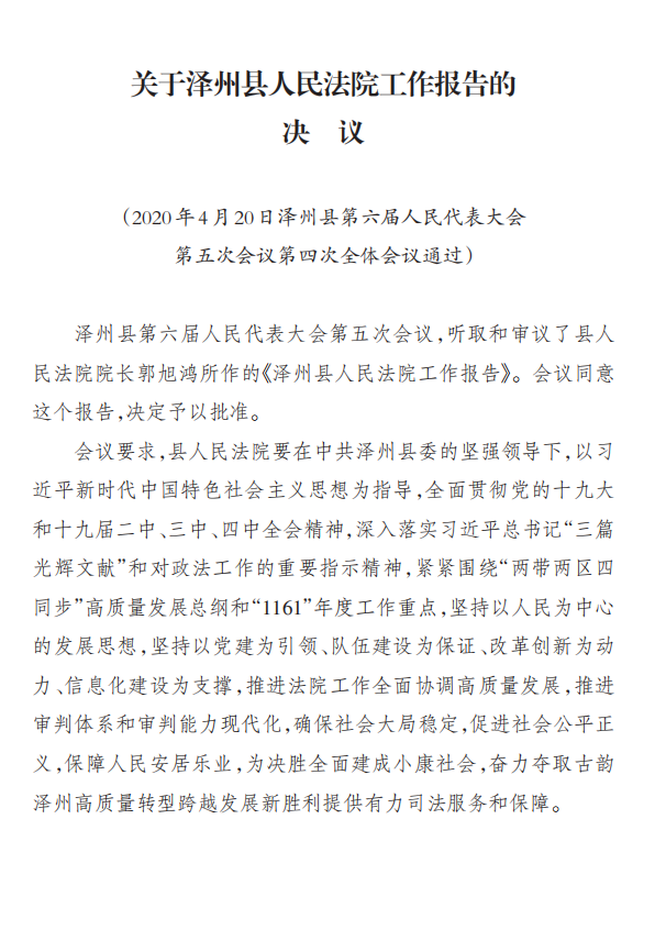 關(guān)于澤州縣人民法院工作報(bào)告的決議