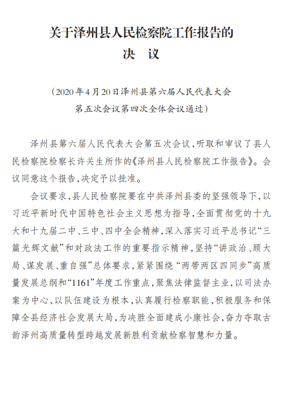 關(guān)于澤州縣人民檢察院工作報告的決議