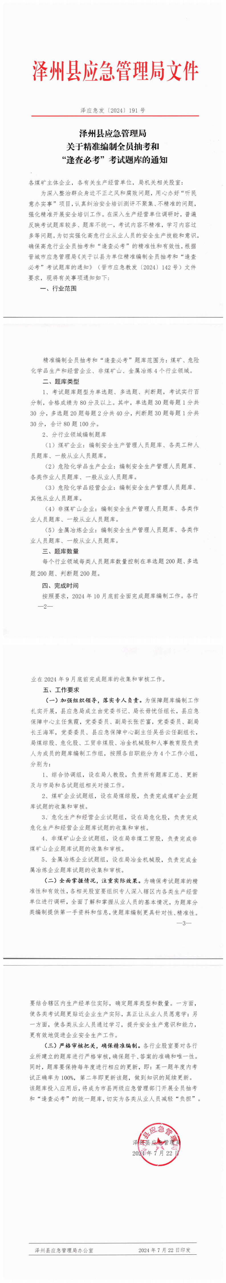 澤州縣應(yīng)急管理局 關(guān)于精準(zhǔn)編制全員抽考和“逢查必考”考試題庫的通知